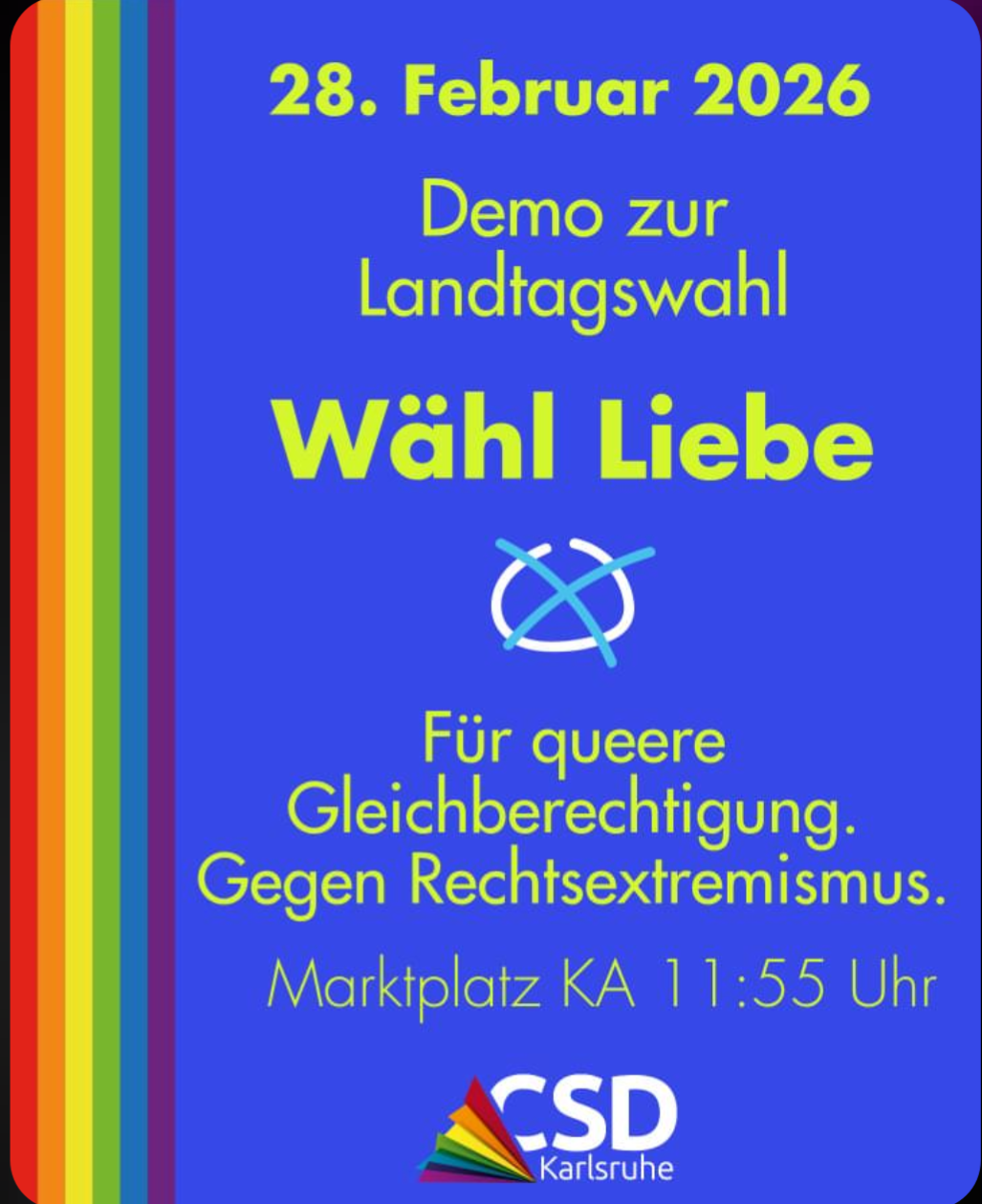 CSD Karlsruhe Winterdemo Alle Information zum CSD findest du auf der Veranstaltungsseite der Organisator*innen. Datum 28.02.26 Lokale Uhrzeit Zeitzone: America/New_York Datum: 28.02.26 Mehr Info Weiterlesen Labels Baden-Württemberg Veranstaltungsort Karlsruhe Karlsruhe Kategorie CSD Veranstalter CSD Karlsruhe Weiterlesen Teile diese Veranstaltung Kategorien Aktionen (14) Allgemein (10) CSD Deutschland (20) CSD Saison (6) CSD Termine (3) Forderungen (25) Grußwort (4) Hilfe & Unterstützung (9) Pressemitteilung (24) Queerstimme (2) Verein (10) Vorstand (1)